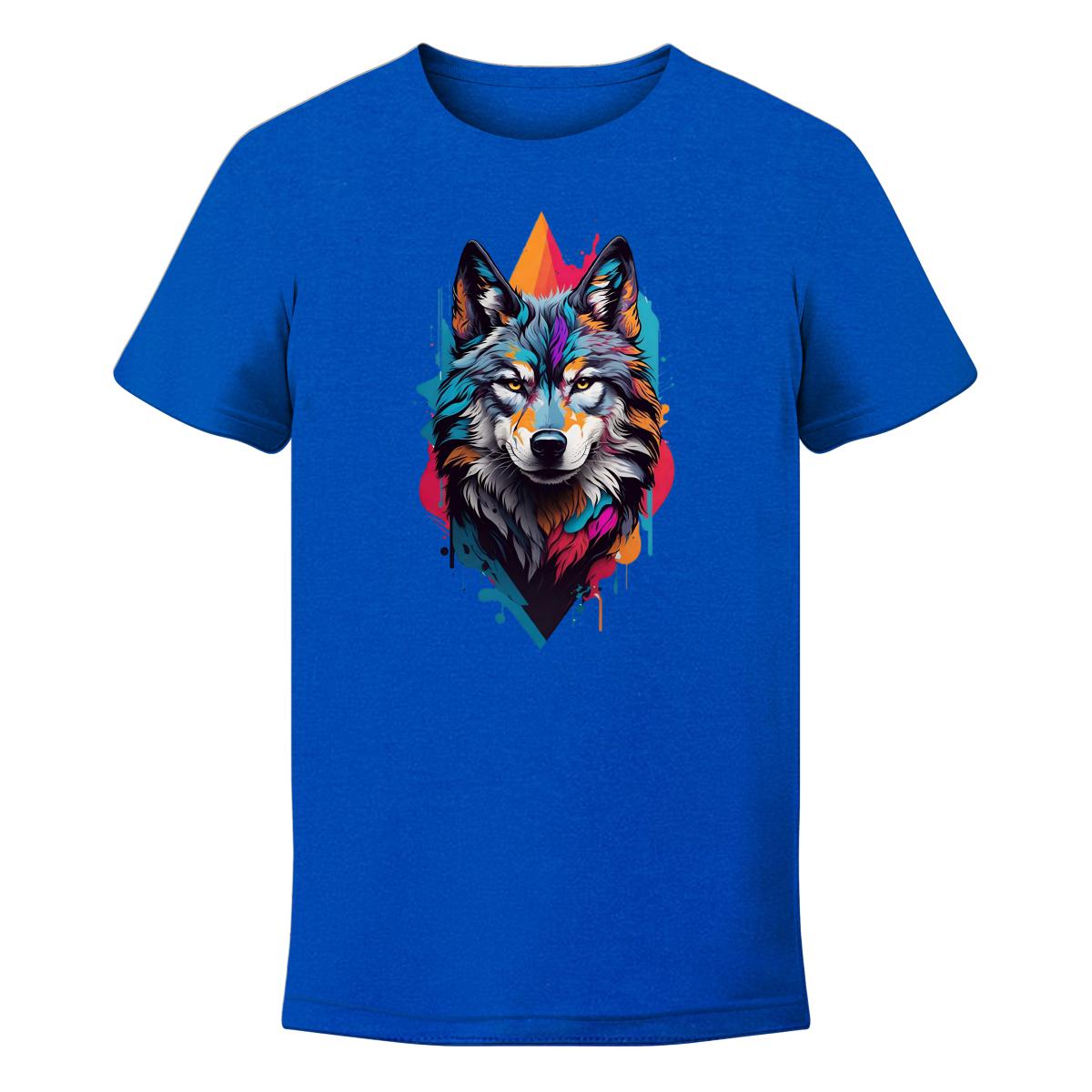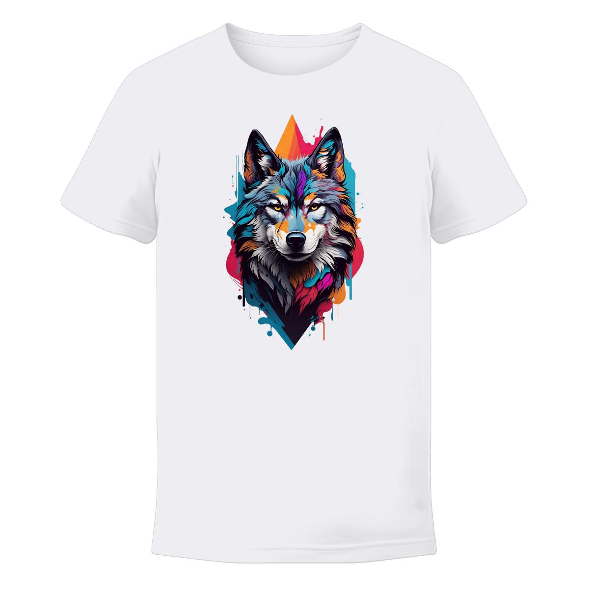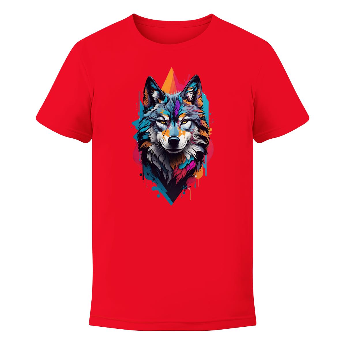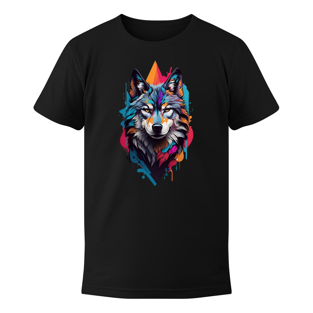 Koszulka męska z nadrukiem kolorowego wilka.