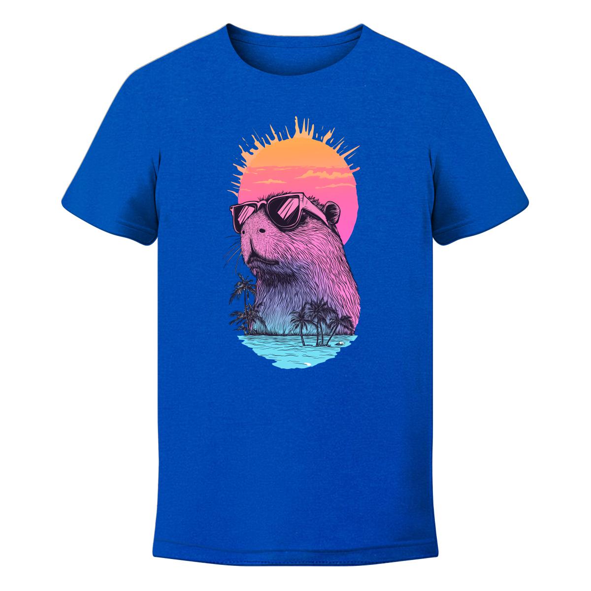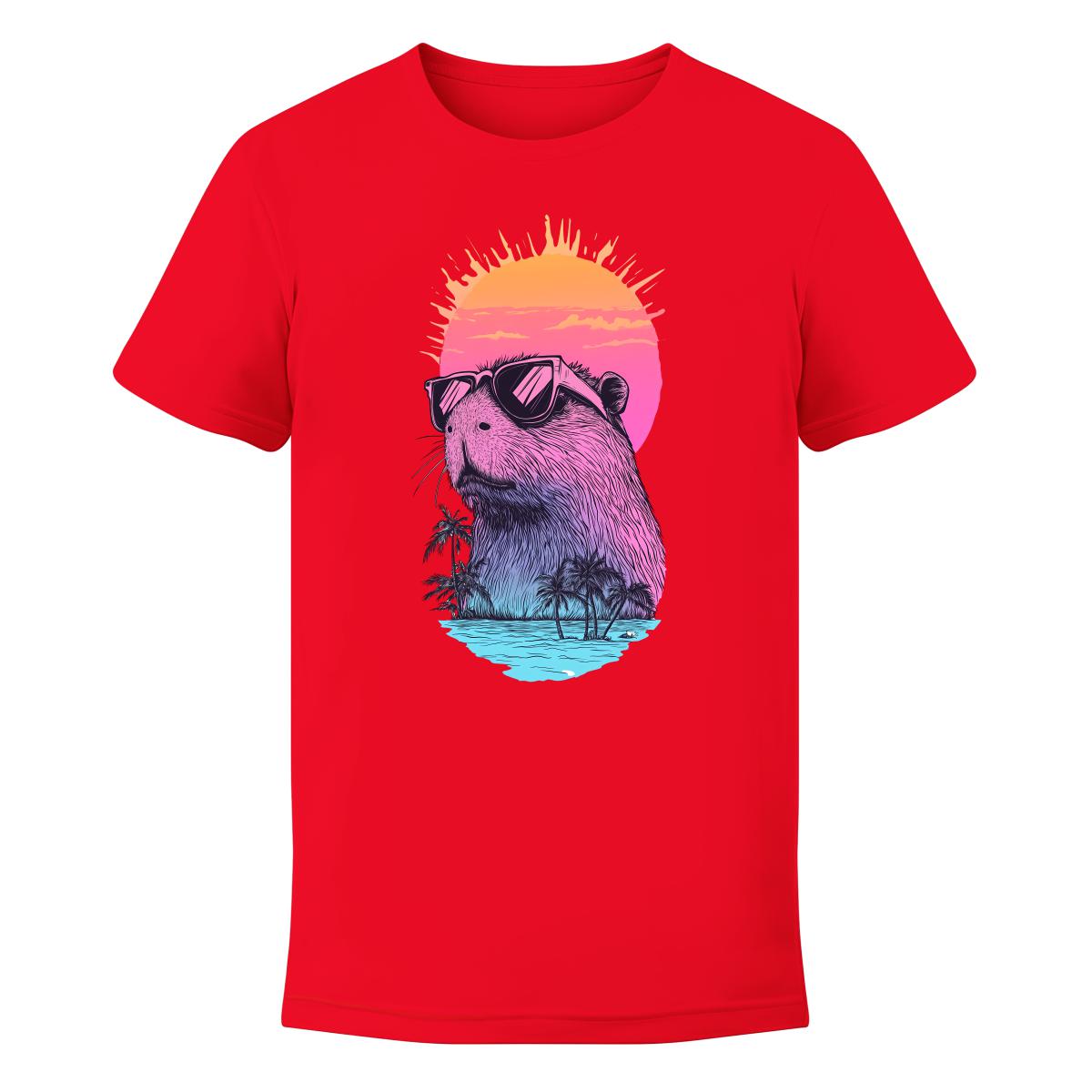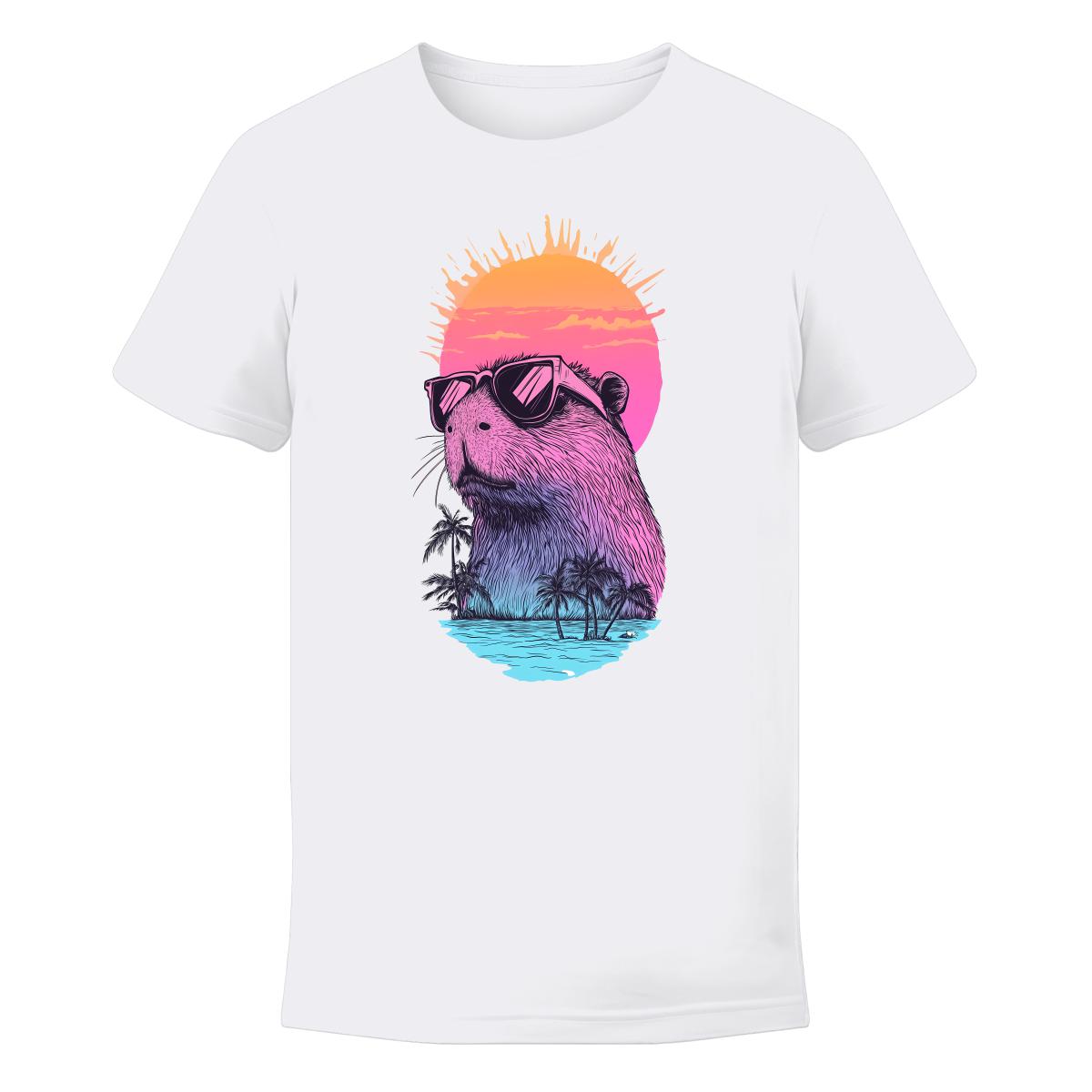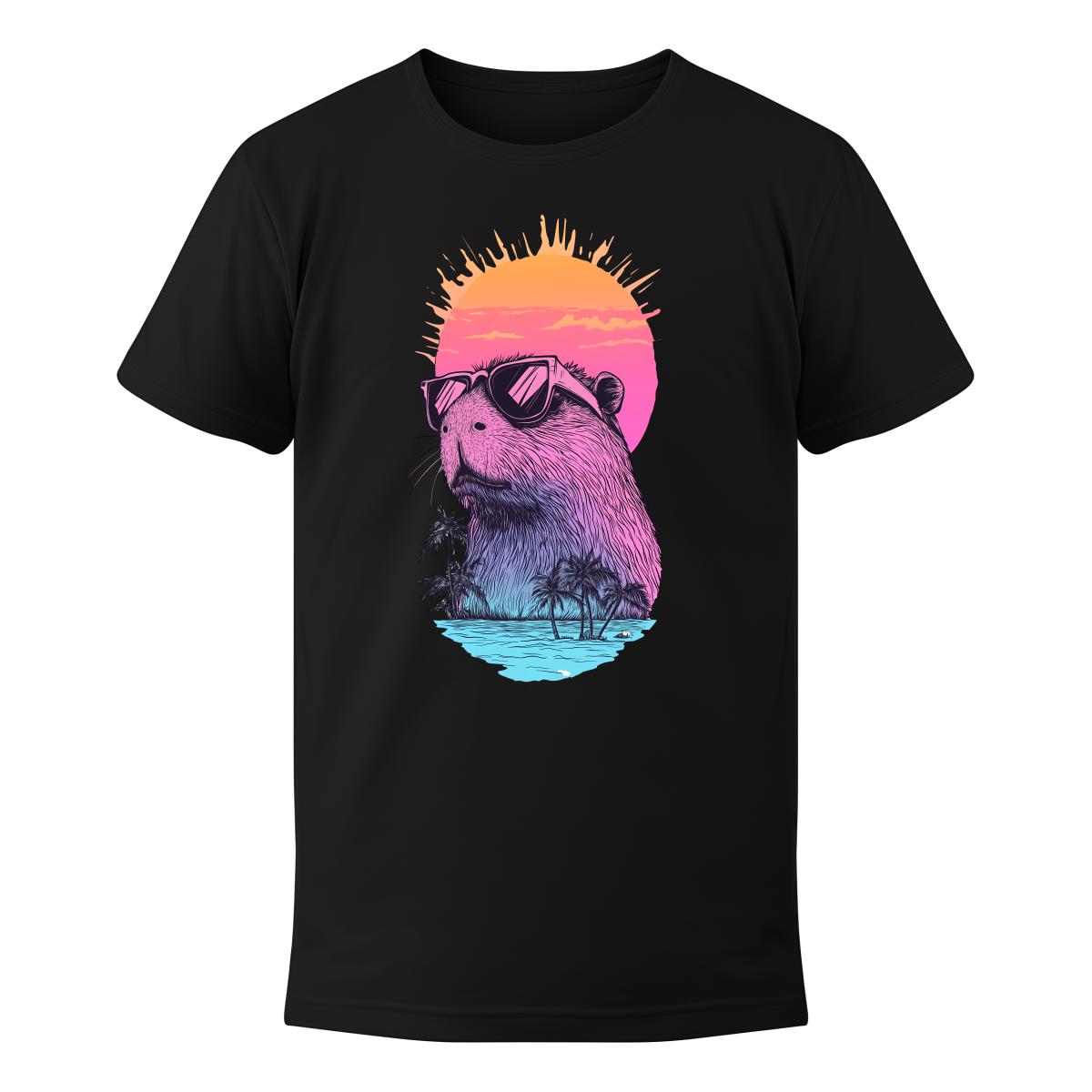 Koszulka z nadrukiem Kapibary na tle zachodzącego słońca to idealny prezent dla fana tego sympatycznego gryzonia.